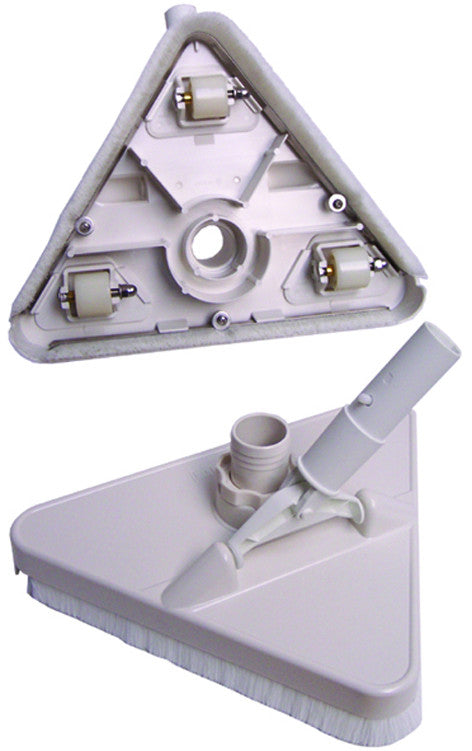 Cleany Dreieck Bodensauger mit umlaufendem Bürstenkranz, Rollen und einer flexiblen Gelenkführung, Ø 38 mm Sauganschluss drehbar. Hochwertiges schweizer Qualitätsprodukt das besonders auch zur Reinigung von Schwimmteichen empfohlen wird. ►Art. 21021161 Kreuzgelenk mit Telestangenadapter (Ersatzteil).