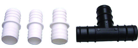 Schlauchverbinder als Doppelschlauchtülle für Saugschläuche in 38/38 mm, 32/32mm und 38/32mm, einteilig, weiß. T-Stück in 38mm, schwarz.