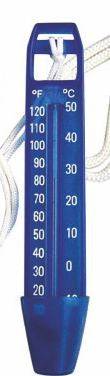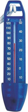 ►Rundthermometer mit Befestigungsleine, ca. 17cm, Fahrenheit- und Celsiusanzeige, weiß. ►Thermometer mit Schöpfkelle zur Messwasserentnahme, in zwei Größen 16,5cm und 24cm, Fahrenheit- und Celsiusanzeige, blau.
