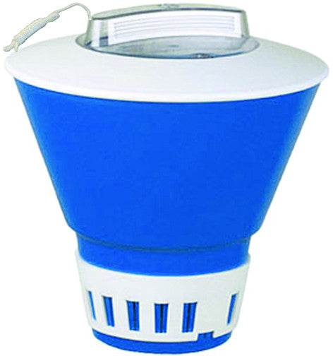 CHEMDOS Chlordosierschwimmer in blau/weiß, verstellbarer Dosierring, Ø ca. 18 cm, Höhe ca. 16 cm, Deckelöffnung Ø 9,5 cm. Inkl. Öse mit Halteleine.