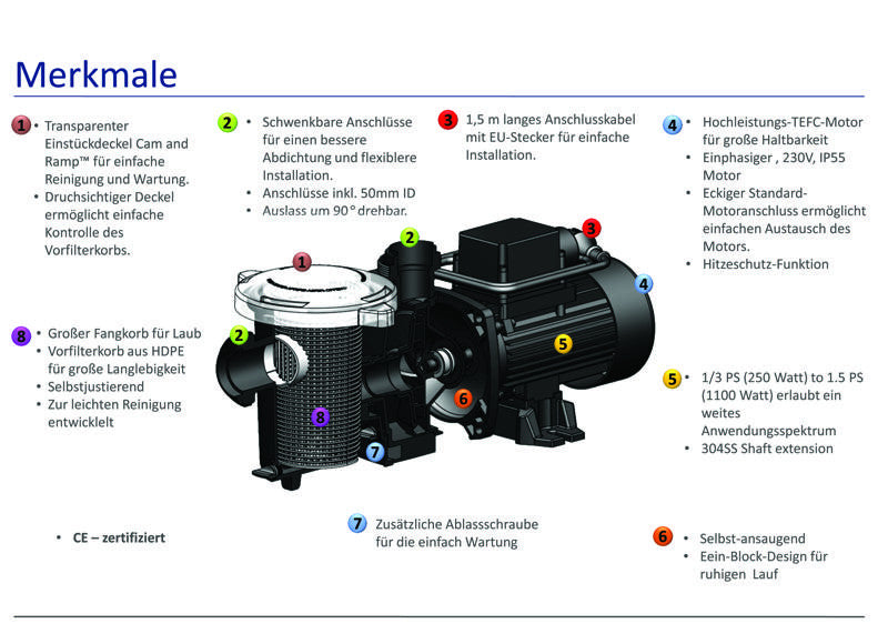 Die FreeFlo-Pumpe wurde speziell als beste Wahl für zahlreiche Aufstell- und kleine Einbaubecken entwickelt. Dickwandige Gehäuseteile, ein Hochleistungsmotor und eine hochentwickelte Hydraulik machen diese robuste und geprüfte Konstruktion perfekt für jeden Pool. ►Technische Daten:- saug- und druckseitige Anschlüsse: d50mm- Salzwasser: Nein- Durchfluss bei 8m Wassersäule!