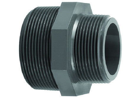 PVC-Reduzierdoppelnippel grau, mit Rohraußengewinde 2" x Rohraußengewinde 1 1/2".