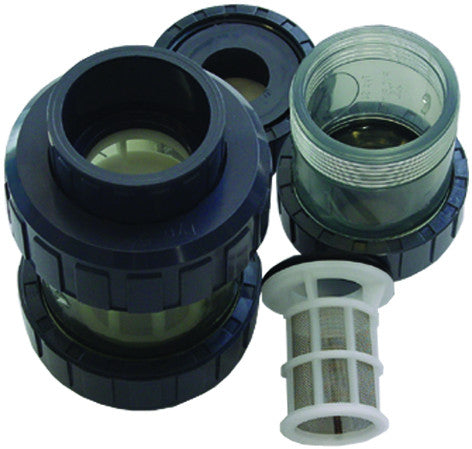 PVC-Schmutzfilter inkl. Kunststoff-Siebrohr, Maschenweite 1,8 mm (1800 micron), 2 Verschraubungen mit Klebemuffen. Einbau z.B. vor einem Kegelrückschlagventil.