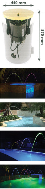 Die Magic-Stream ist die Attraktion in jeder Poolanlage. Sie erzeugt einen durchsichtigen, sich einheitlich bewegenden, Wasserbogen. Die Montage erfolgt entweder bündig im Pooldeck oder außerhalb des Beckenbereichs. Optisch schöner sind zwei oder drei Geräte in Reihe. Die Bögen können bis 2 m Höhe und 2,5 m Weite erreichen. Die Beleuchtung erfolgt über im Gehäuse integrierte LED-Strahler. Das Farbspektrum ist entweder duchlaufend in RGB oder weiß. Zum Lieferumfang gehört der fertige Einbausatz (d 440 mm, H 570 mm) und eine separate Lichtmaschine. Die Wasserversorgung beträgt 38 l/min und erfolgt über einen Anschluss d32 mm. Die Magic-Stream wird mit einem 10 m langen Kabel geliefert. Verwenden Sie einen Poolbeleuchtungstrafo 230/12VAC-100 W mit FI-Schutzschalter. Bis zu sechs MagicStream lassen sich mit einem Trafo betreiben. Die Verrohrung und ein geeigneter 12 V-Trafo gehören nicht zum Lieferumfang.