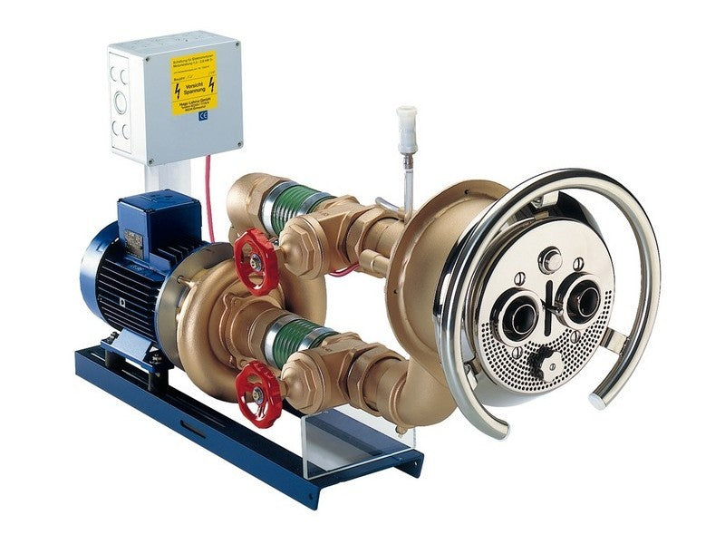 Lahme-Gegenstromschwimmanlage TAIFUN DUO mit verstellbaren Düsen, Pumpenleistung 2,6 kW, Leistungsaufnahme 3,4 kW, 400 V, Düsenleistung 1050 L/min bei 10 m Wassersäule. Es sind ein Wandeinbauteil, der komplette Anschlusssatz mit Pumpe inkl. 2 Absperrschieber für druck- und saugseitige Montage, bei Folien- und Fertigbecken der Flanschringsatz und der Haltegriff, die Pumpenkonsole und ein Massageschlauch separat zu bestellen.