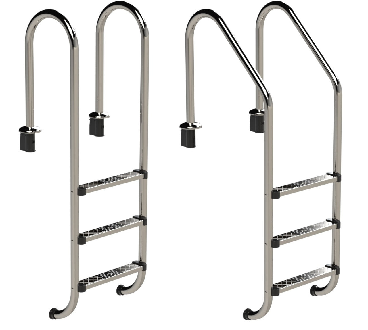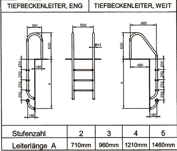 Edelstahl poliert V2A, Holm Ø43 mm, gleitsichere profilierte Stufe mit einer Auftritt-Tiefe von 80 mm, komplett mit einzubetonierenden Einbauhalterungen, senkrechter Stufenabstand 250 mm, Breite Mitte Mitte Holm 500 mm. Traglast max. 120 kg. Geeignet für private Schwimmbecken mit senkrechter Beckenwand. Beide Ausführungen sind 2 bis 5-stufig erhältlich, Leiterlänge siehe Maßblatt.► ENG - Ausladung hinter Beckenkante ca. 180 mm, Holmhöhe über dem Beckenrand ca. 630 mm ► WEIT - Ausladung hinter Beckenkante ca. 480 mm, Holmhöhe über dem Beckenrand ca. 630 mm.► Optional können Sie die normalen Stufen gegen Sicherheitsstufen austauschen (Art.37985563) und zur Montage auf dem fertigen Beckenrand gibt es das Flanschmontage-Set (Art.37663322)