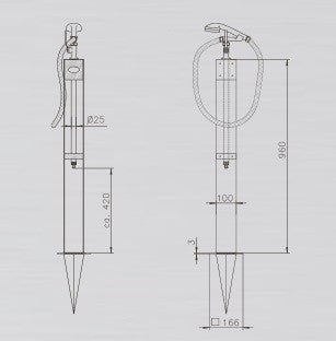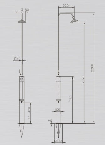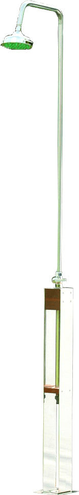 Kaltwasser Gartendusche "Altena" und "Altena mini" (nur mit Handbrause), zwei formschöne Duschen aus witterungsbeständigem Holz und Edelstahl V2A. Beide sind in kurzer Zeit aufgebaut, Wasseranschluss an der Dusche durch ½“ Außengewinde. Der Duschkopf besteht aus verchromtem Kunststoff, als Armatur dient ein verchromter Messing - Kugelhahn. Gewicht: Altena ca. 13 kg / Altena mini ca. 10 kg, der Erdspiess gehört zum Lieferumfang. Höhe bis Duschkopf Altena = 2070 mm, Altena mini 960 mm. Typ Kaltwasserdusche.