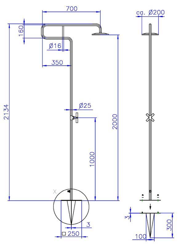 Gartendusche "Trombone" mit integiertem Handtuchhalter. Diese Edelstahldusche lässt sich mit dem Erdspiess schnell und sicher im Rasen, oder mit Hilfe der Bodenplatte überall befestigen. Zum Anschluss benötigen Sie nur noch einen Gartenschlauch mit Gardena-Adapter (Wasseranschluss an der Dusche durch 1/2" Außengewinde) und schon ist die Kaltwasser-Dusche einsatzbereit. Der Duschkopf besteht aus verchromtem Kunststoff, die Armatur aus verchromtem Messing. Gewicht inkl. Erdspiess, Schrauben und Dübel ca. 8 kg. Maße: Fuss 250 x 250 mm, Höhe bis Duschkopf 2000 mm. Duschkopf verstellbar.