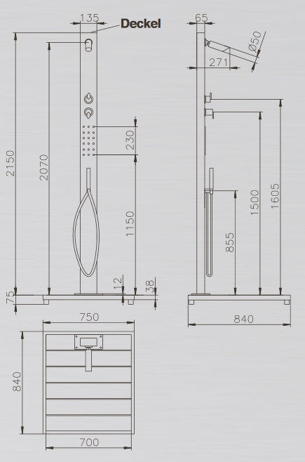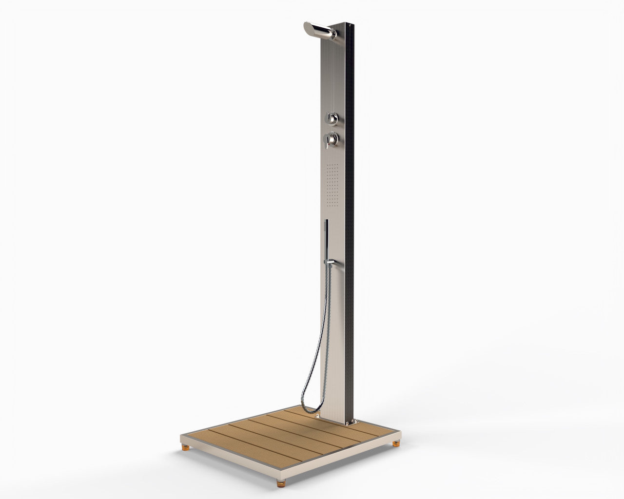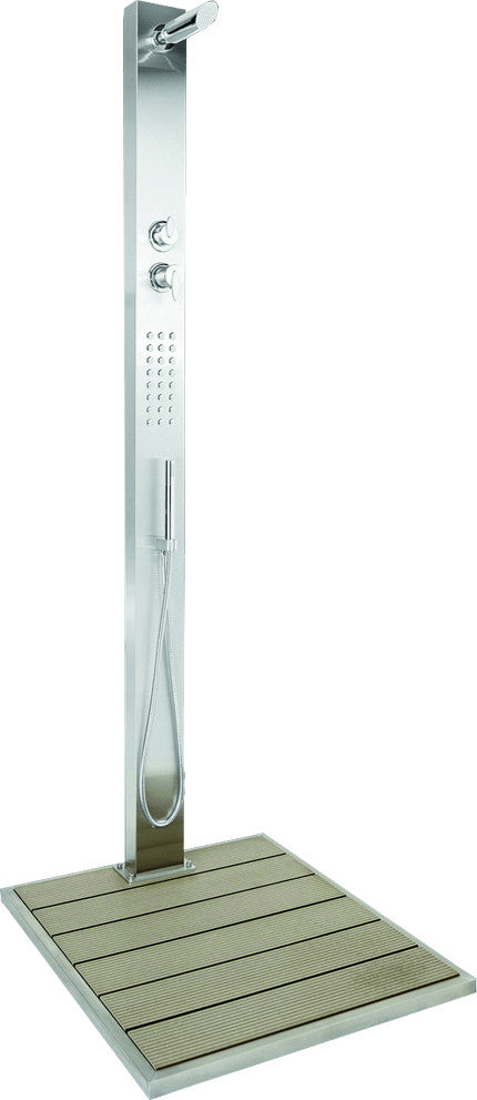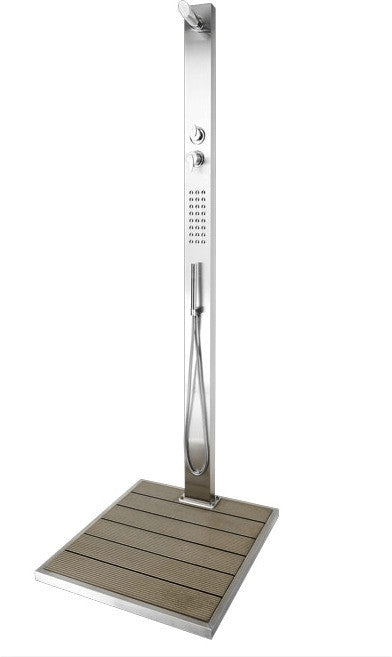Edles V2A Material, klares Design kombiniert mit Duschvergnügen - so stellt sich die Gartendusche "Malta" vor. Die Kopf-, Hand- bzw. Köperbrausefunktionen sind getrennt über zwei Brausehebel einstellbar. Einfacher kann eine Dusche nicht bedient werden. Die große Bodenplatte, eine Kombination aus Edelstahl und WPC bietet reichlich Platz und verbirgt die beiden 1/2" IG Anschlüsse für Kalt- und Warmwasser. Die Armaturen sind Messing verchromt, Gewicht ca. 33 kg. Maße: Fuss 750 x 840 x 75 mm, Höhe bis Duschkopf 2070 mm. Duschkopf verstellbar.