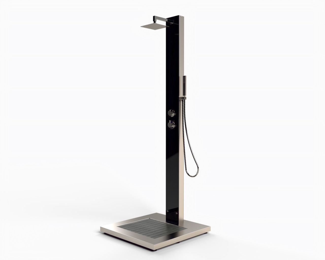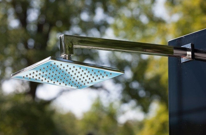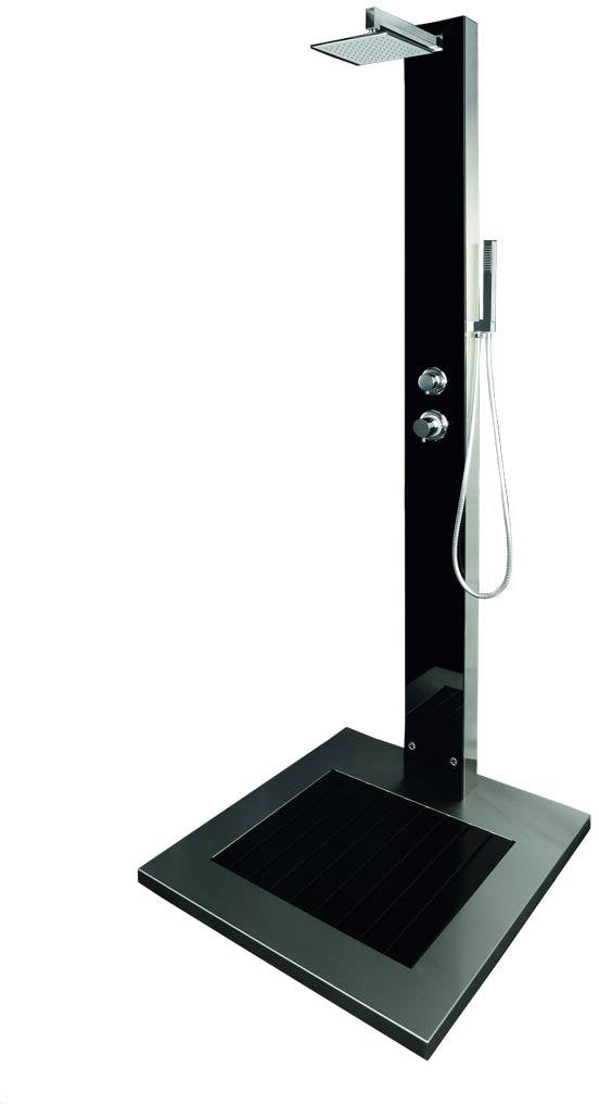 Die Gartendusche "Kuba" besticht durch ihre schlichte Eleganz und ihr klares und modernes Design. Glänzender Edelstahl in Verbindung mit schwarzem Sicherheitsglas- ein Highlight für alle, die klare Formen lieben. Der verstellbare, verchromte Duschkopf und die Einhebel-Mischbatterie sind weitere Pluspunkte. Pflegeleicht und langlebig - freuen Sie sich auf Ihre Erfrischung in Ihrem Garten. Höhe bis zum Duschkopf - 2050 mm, Bodenplatte - 840 x 750 x 60, Gewicht 37 kg, Gesamthöhe 2100 mm, Armatur Messing verchromt, WPC und Edelstahl V2A, Sicherheitsglas 8 mm, Wasseranschluss durch Flexschläuche Kalt- und Warmwasser unter der Plattform, 2 x ½“ Innengewinde