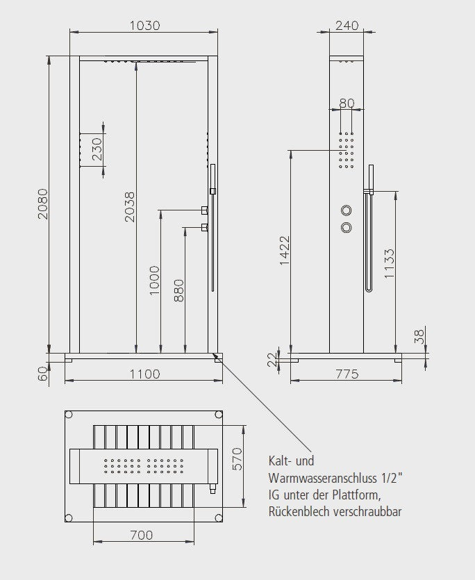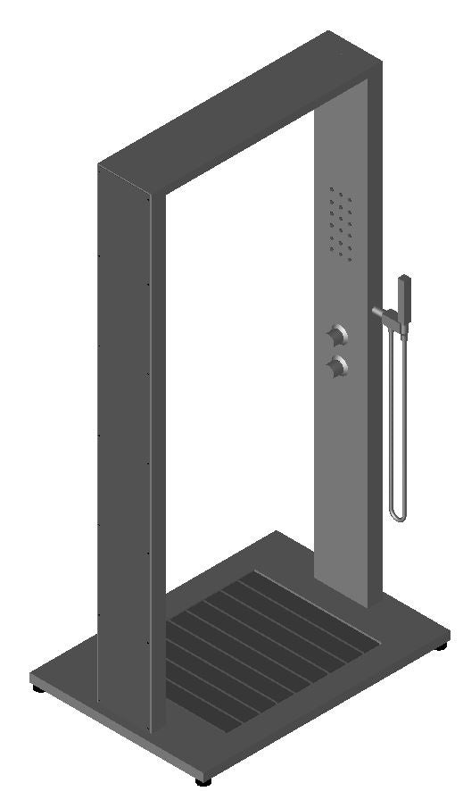 Kalt- & Warmwasser-Dusche "SAMOA" in Portalform für private Schwimmbäder und Gärten. Mit breiter Kopfdusche und zwei seitlichen Körperduschen, ein Highlight für die ganze Familie. Armaturen Messing verchromt, Handbrause Kunststoff verchromt. Edelstahl V2A, Wasseranschluss durch Flexschläuche Kalt- und Warmwasser unter der Plattform, 2 x ½“ Innengewinde.