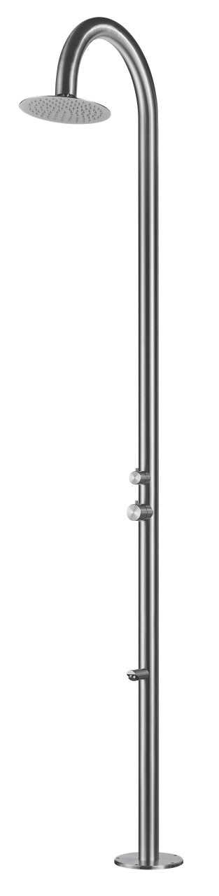 Design und Funktion im perfektem Einklang. Die Kalt- und Warmwasserdusche NORDERNEY erfrischt nicht nur mit einem großen Duschkopf (Durchmesser 200 mm), sondern besticht auch durch ein weiteres praktisches Detail. Mit einer Fußdusche reinigen und erfrischen Sie schnell und einfach ihre Füße oder Gartenschuhe. Der Einhebelmischer regelt die entsprechende Wassertemperatur und fertig ist das Duschvergnügen. Der Sommer kann kommen! Gewicht ca. 23 kg, Maße: Flanschplatte Durchmesser 200 mmm, Höhe bis Duschkopf 2.439 mm.