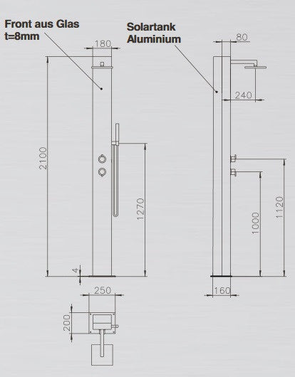 Der eckigen Wassertank aus geschwärztem Aluminium mit ca. 25 Liter Inhalt bietet bei Sonnenschein ausreichend warmes Wasser für ein tolles Duschvergnügen. Die top-moderne Solardusche wird mit einer Glasfront geliefert, in vier verschiedenen Farben erhältlich: blau, weiß, rot oder schwarz. Die mitgelieferten Bodenanker erleichtern den schnellen Auf- und Abbau. Duschkopf verstellbar.