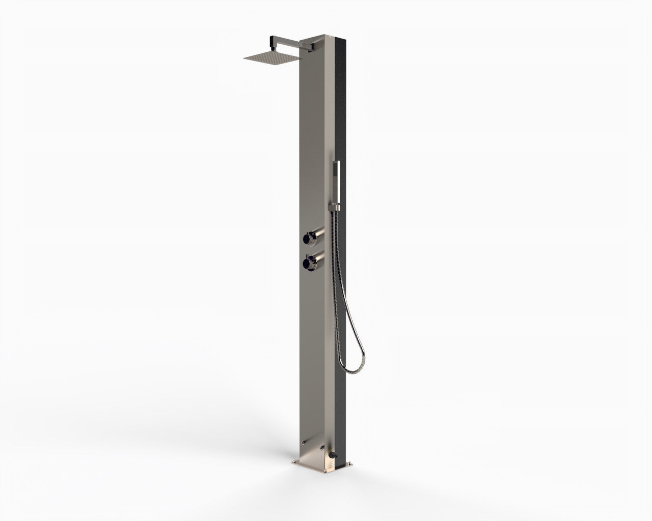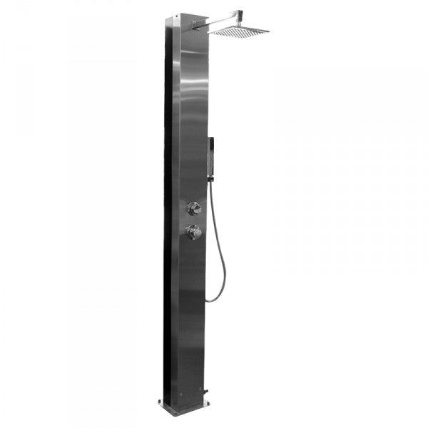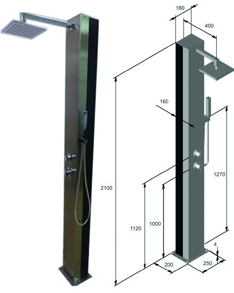 Solardusche Trinidad, Gehäuse Edelstahl V2A, Wassertank Aluminium (Inhalt ca. 25 l) außen lackiert, seitlicher Wasseranschluss für Wasserschlauchsysteme (Gardena o.ä.), Armaturen Messing verchromt, Handbrause Kunststoff verchromt, Kopf- und Handdusche, Flanschmontage auf fertigem Boden, Flanschplatte 250 x 200 mm. Gesamthöhe 2100 mm. Duschkopf verstellbar.