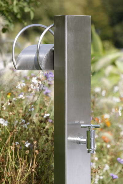 Wasserentnahmestelle für private Schwimmbäder und Gärten. Edelstahl V2A geschliffen, 120x80mm, mit Schlauchhalter. Typ Kaltwasser. Höhe 100 cm, Bodenplatte 180 x 140 mm, Höhe der Wasserentnahme 53,5 cm. Wasseranschluss 1/2“ Innengewinde durch den Bodenflansch. Armaturen Messing verchromt.