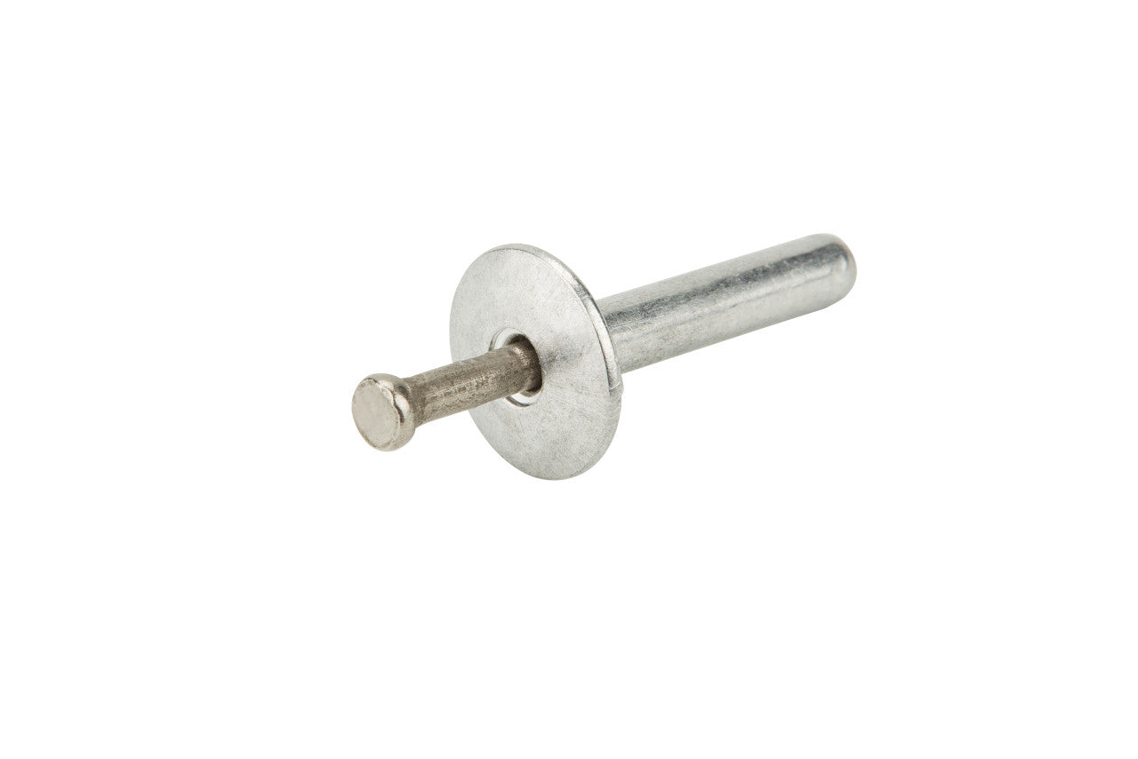 Schlagdübel in Edelstahl-Ausführung, Spreizung durch Einschlagen in Mörtel. Er ist geeignet für die Befestigung der gewebeverstärkten Abdichtungsbahn an Beckenboden und von Verbundblechprofilen. Am Beckenkopf ist zusätzlich als mechanische Befestigung Verwendung von Kontaktkleber oder Polyurethanmasse notwendig.