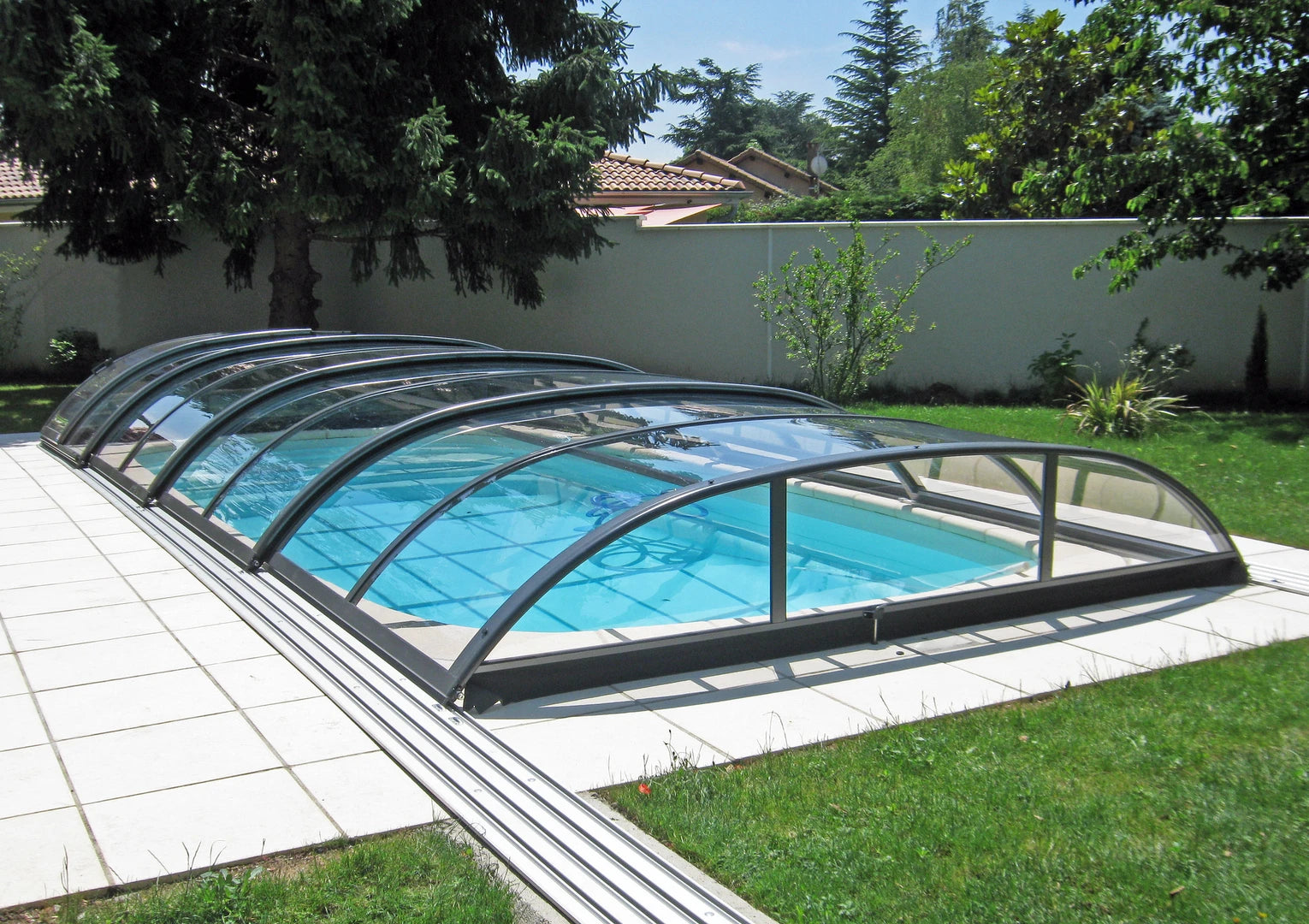 Dieses Modell verfügt über vier verschiebbare Überdachungselemente, die auf einer flachen, begehbaren Azure-Laufschiene geführt werden. Die Segmente sind beidseitig verfahrbar und ermöglichen den flexiblen Zugang zum Becken – vom Teilöffnen bis zur weitgehenden Freilegung.