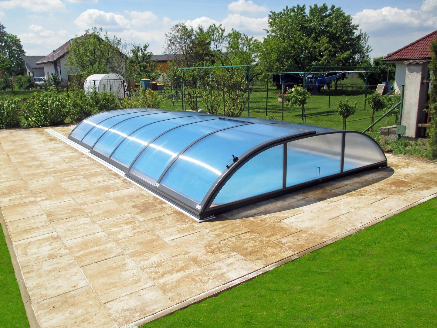Als Verglasung kommen klare 8 mm Doppelsteg-Polycarbonatplatten zum Einsatz. Das Material ist UV-stabil, bruchfest und pflegeleicht und sorgt für einen guten Lichteinfall bei gleichzeitigem Schutz der Wasserfläche. Die Segmente bewegen sich auf einer flachen, etwa 14 mm hohen Azure-Laufschiene, die beidseitig begehbar ist.