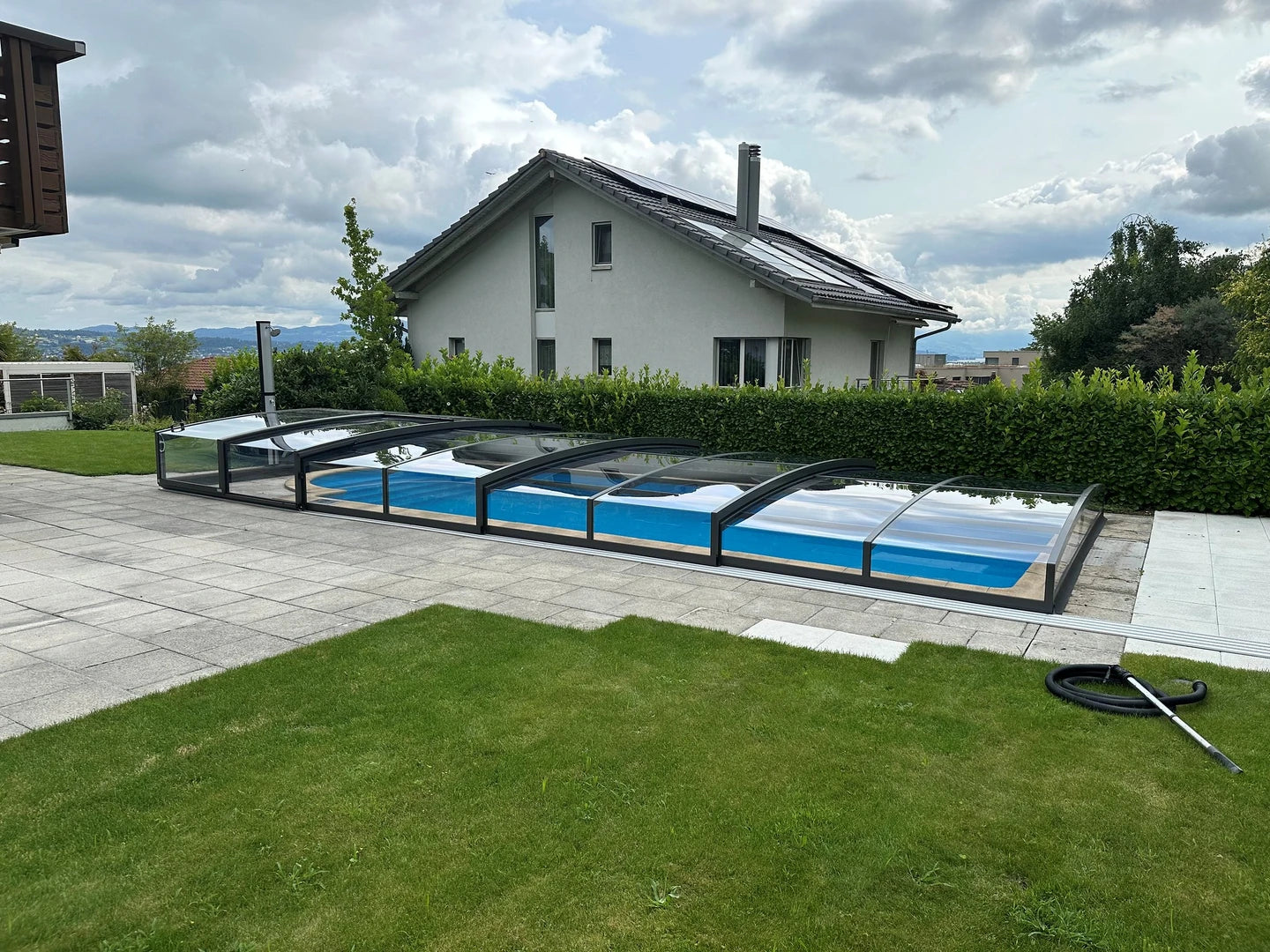 Die Überdachung reduziert den Schmutzeintrag, hilft, Wärmeverluste zu begrenzen und unterstützt eine längere Badesaison. Gleichzeitig verbessert sie die Sicherheit, da der Poolbereich abschließbar ist.