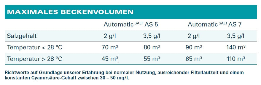 - Bei 1,5 g/l Salzgehalt: für Beckenvolumen bis 75 m³ bei 28 °C, oder bis etwa 50 m³ bei Wassertemperaturen über 28 °C.