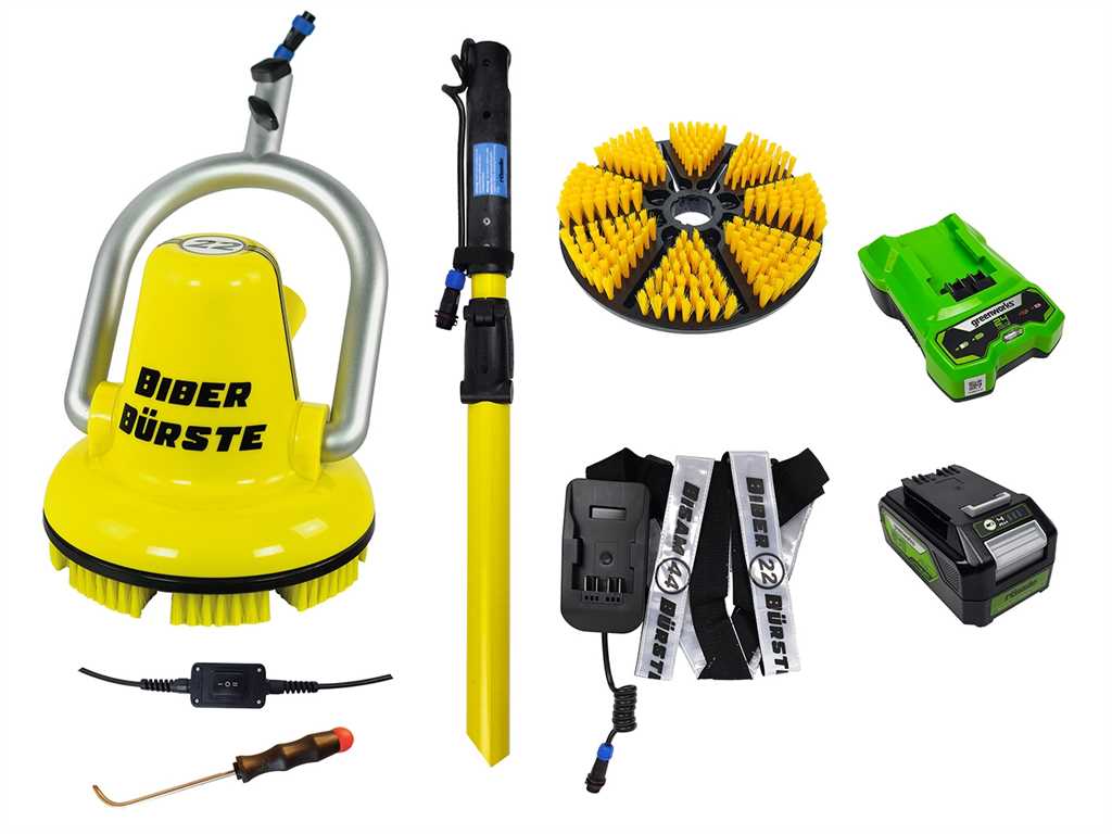 Die Schaltereinheit ermöglicht den Wechsel der Drehrichtung des Bürstenkopfs. Damit passen Sie die Bewegung gezielt an Ecken, Rundungen und schwer erreichbare Stellen an. Das Li‑Ion Akku-Set mit 24 Volt und 4 Ah liefert eine Laufzeit von etwa ein bis zwei Stunden. Der Akku ist mit dem Schnellladegerät in ungefähr einer Stunde wieder einsatzbereit. Der Gürteladapter mit Tragegurt sorgt für bequemes Tragen von Akku und Steuerung.